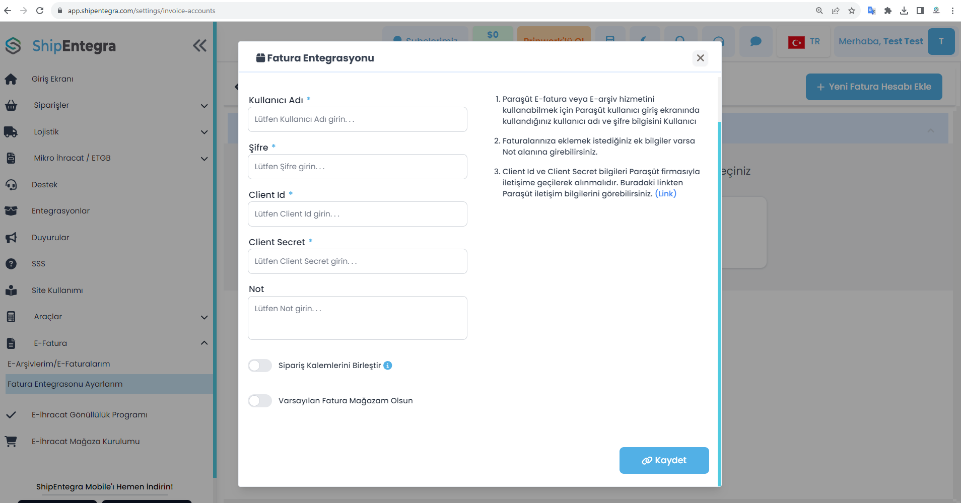 - ShipEntegra& Paraşüt entegrasyonu aracılığıyla e-arşiv fatura hazırlamak için ‘Kullanıcı adı ve Şifre’ alanına Paraşüt hesabınızda bulunan adınız ve şifreniz ile giriş yapmalısınız.